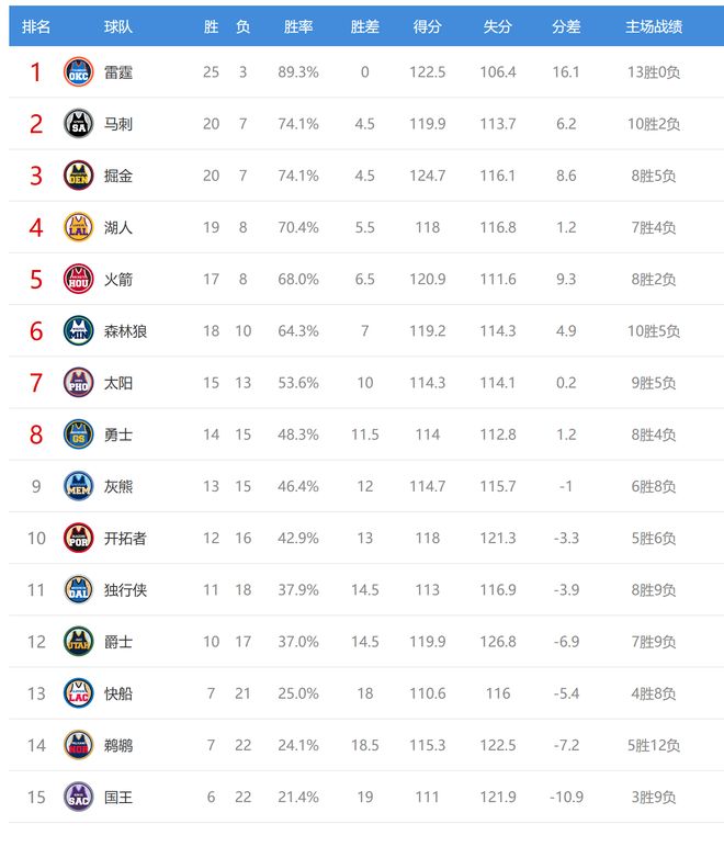 火箭贏球后17勝8負(fù),繼續(xù)排名西部第五,掘金輸球后20勝7負(fù),排名從西部第二掉到第三,今日沒有比賽的馬刺坐收大禮,排名升到第二,不過馬刺、掘金戰(zhàn)績是一樣的,雙方排名隨時可能互換。