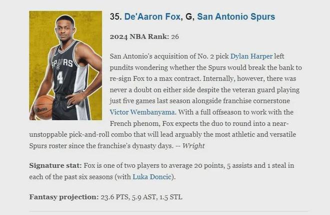 在賽季初ESPN評選的NBA2025-26百大球星中,??怂古琶?5(2024-25賽季排名第26),排名略有下降,網(wǎng)站評語如下:圣安東尼奧馬刺隊用榜眼秀選中迪倫-哈珀后,人們紛紛猜測馬刺隊是否會與??怂估m(xù)簽頂薪合同,盡管這位老將上賽季與球隊基石溫班亞馬僅搭檔出戰(zhàn)五場比賽,但馬刺內(nèi)部對此毫無顧慮,??怂剐葙惼诙荚谂c這位法國天才磨合,期待二人能夠組成近乎無敵的擋拆組合,帶領(lǐng)馬刺打出自GDP王朝之后最具運動天賦和全面性的陣容。